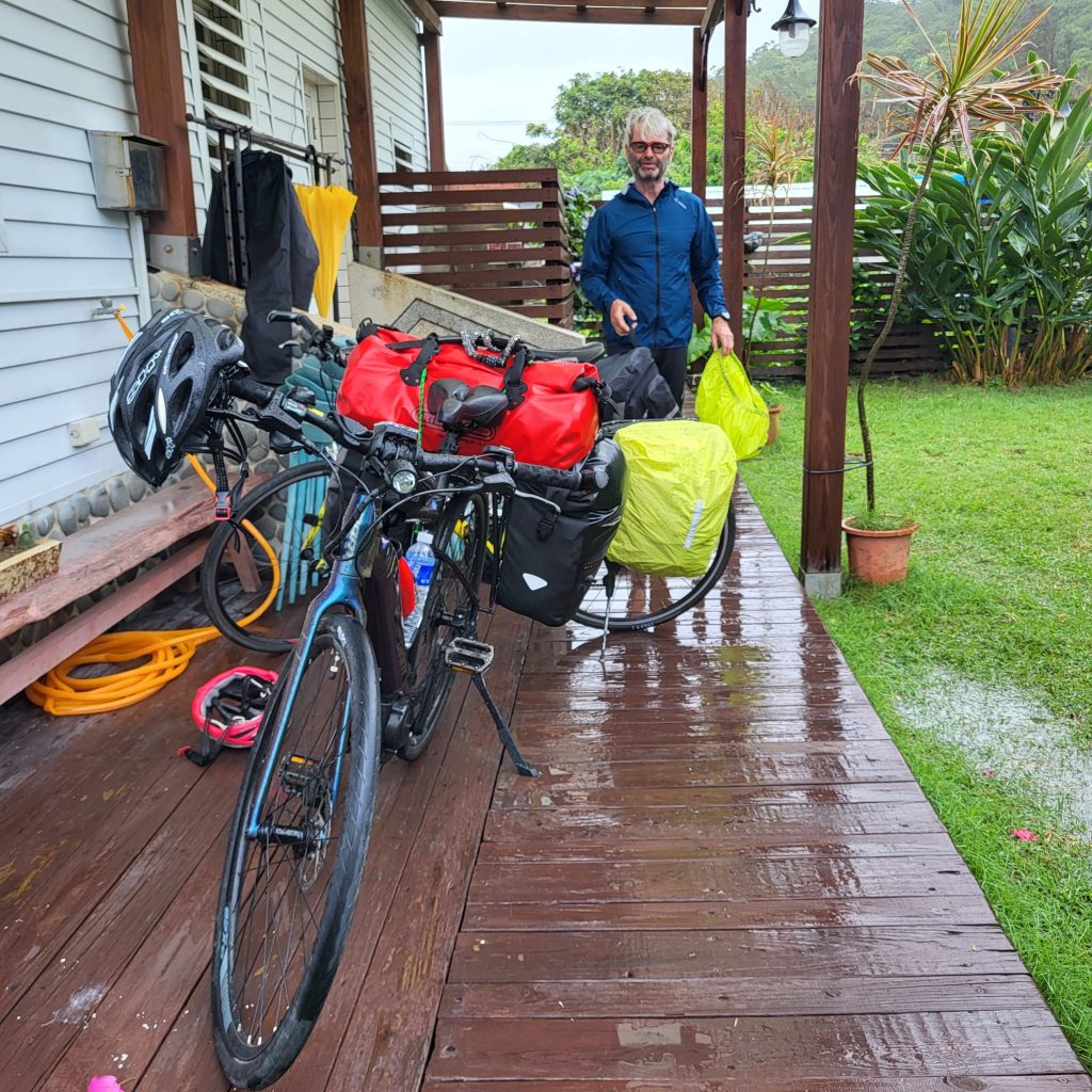 In Taiwan nimmt man die Schuhe nicht mit ins Haus, stattdessen bekommt man Latschen ausgeliehen. Unsere Schuhe stehen vor der Tür als Regensammler. Etwas missmutig satteln wir die Räder und machen uns auf den Weg. Wenigstens ist es warm, aber dafür bläst ein kräftiger Wind direkt von vorn, so dass wir auf gerader Strecke kaum mehr als 16 km/h drauf bekommen.