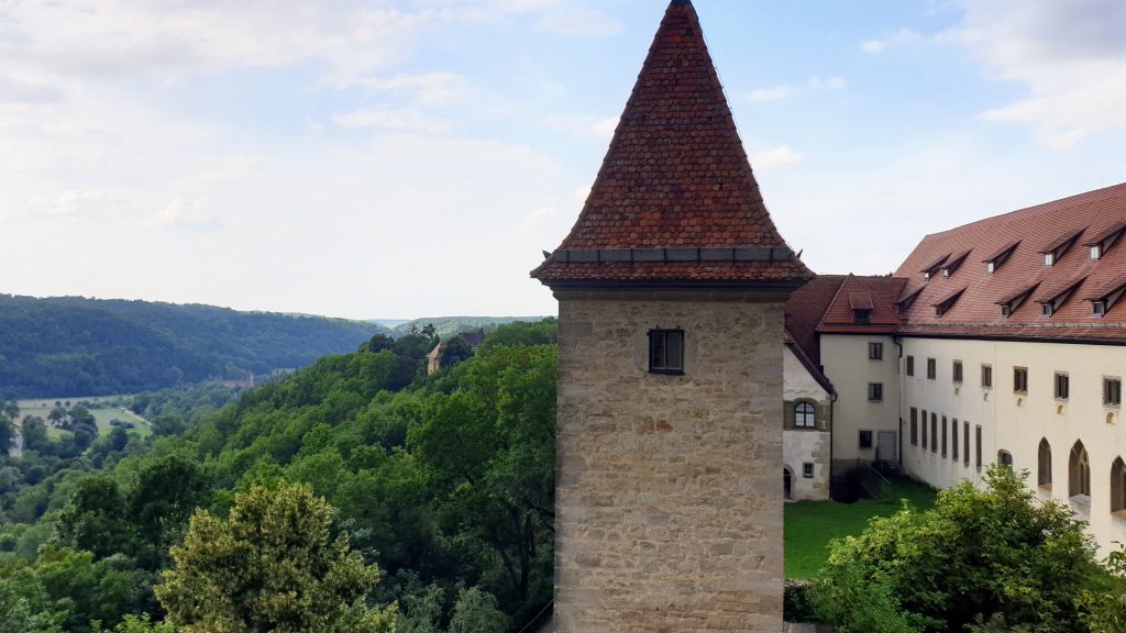 Wir verlassen die hoch über dem Tal liegende Festung durch das Stadttor und fahren wieder hinab ins Taubertal. Dem folgen wir weiter flussaufwärts auf einem straßenbegleitenden Radweg, bis wir nach wenigen Kilometern  die Hauptstraße verlassen. Von nun an führt uns die Radroute für den Rest des Tages überwiegend über ruhige Landstraßen von einem Weiler zum nächsten. Hin und wieder geht es auch über geschotterte Waldwege. Eine Fahrradinfrastruktur, wie wir sie in den letzten Tagen an Main und Tauber erlebt haben, gibt es hier kaum, was aber durchaus seinen Charme hat.