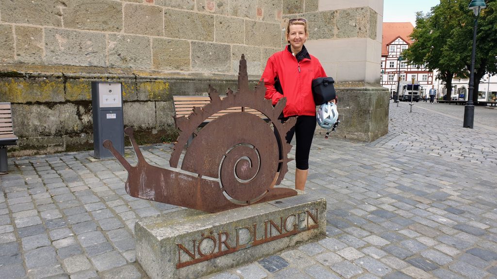 Pause in Nördlingen. Bild mit Schnecke, daneben eine Skulptur 😉