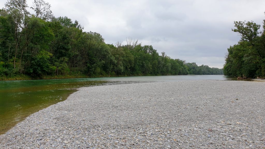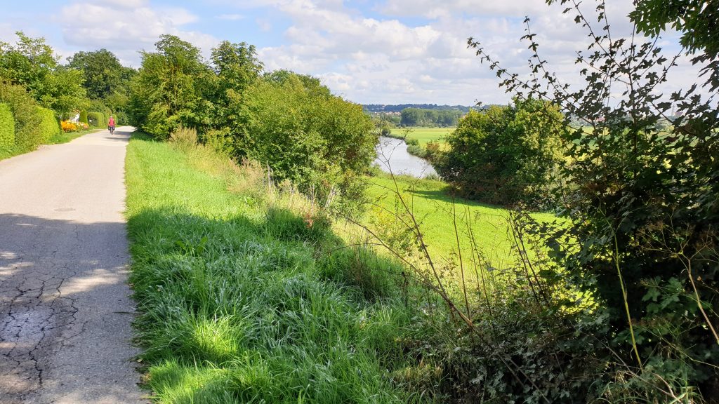 Radrouten an Flüssen haben meistens den Vorteil, dass sie schön flach sind und man sich kaum verfahren kann. Sie haben aber auch einen gravierenden Nachteil: während man im bergigen Gelände ständig die Sitzposition wechselt und auch öfter mal aus dem Sattel geht, sitzt man auf den Flachetappen mitunter stundenlang mehr oder weniger in der gleichen Position und es reibt an der gleichen Stelle. Wenn man dort schon wund ist, wird es unangenehm. Abhilfe schaffen Pausen, in denen das Recken und Strecken auch eine Wohltat für den Rücken ist. Die halten wir aber kurz, denn es ist ungemütlich frisch.