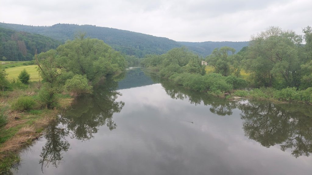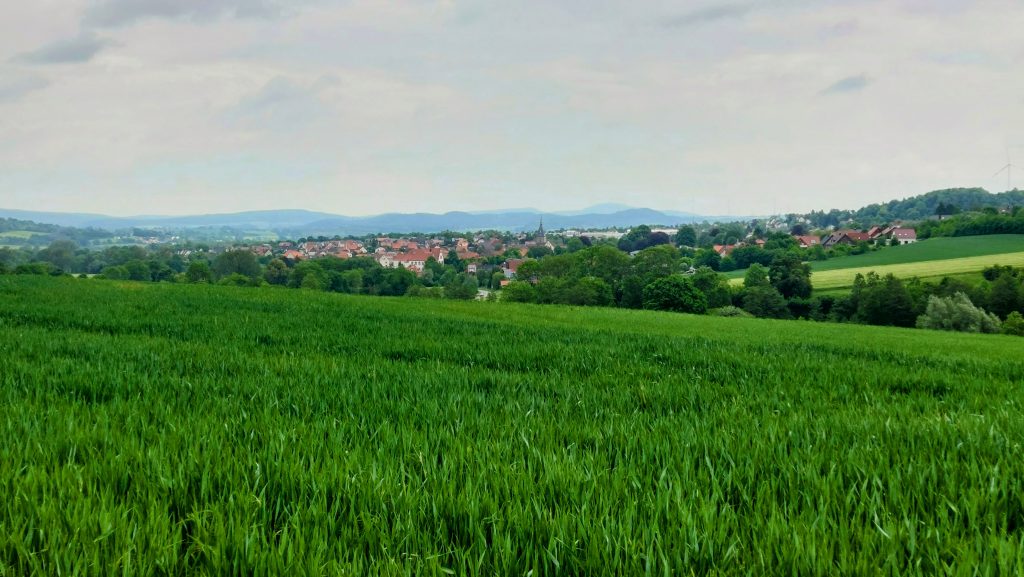 Der erste Abschnitt der Tour führt mich durch die weiten hügeligen Felder Nordhessens und es beeindruckt mich immer wieder, wie dünn Deutschland außerhalb der Ballungsräume doch eigentlich besiedelt ist. Die großen Straßen führen von Stadt zu Stadt und wenn man mit dem Auto dort unterwegs ist, bekommt man einen ganz anderen Eindruck als beim Radeln durch die freie Natur. Ich genieße die Landschaft an meiner Radstrecke, sie ist unspektakulär aber trotzdem wunderschön.
