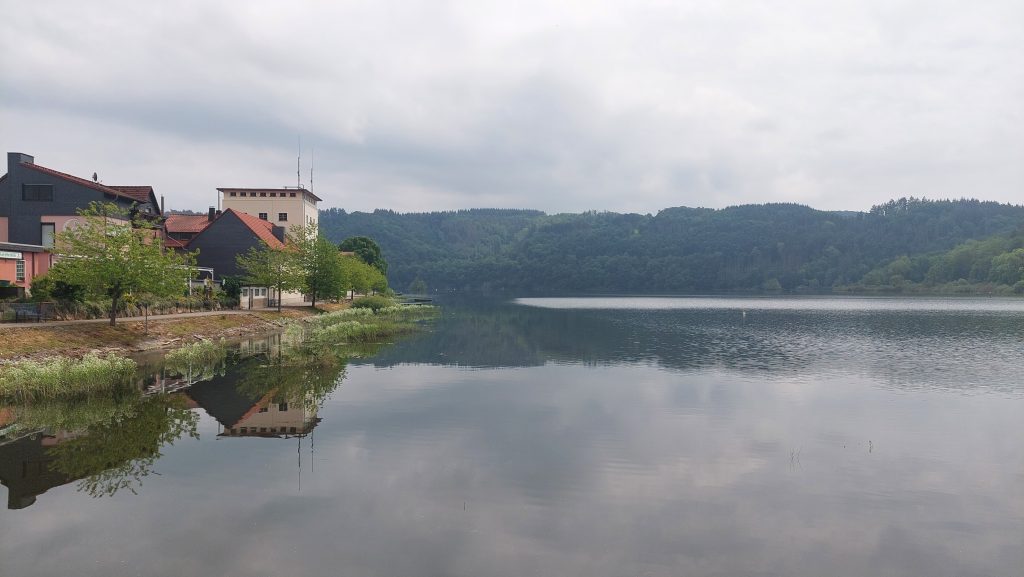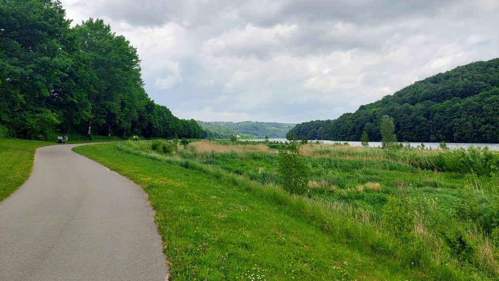 Trotz des Wetterberichts bin ich heute entspannter als am Vortag, denn ich weiß, dass ich ab Frankenberg immer in der Nähe der Bahn unterwegs bin und notfalls umsteigen könnte. Nach knapp 60km erreiche ich den Edersee und genieße noch einmal den Ausblick, bevor es auf den unangenehmsten Abschnitt der heutigen Tour geht.