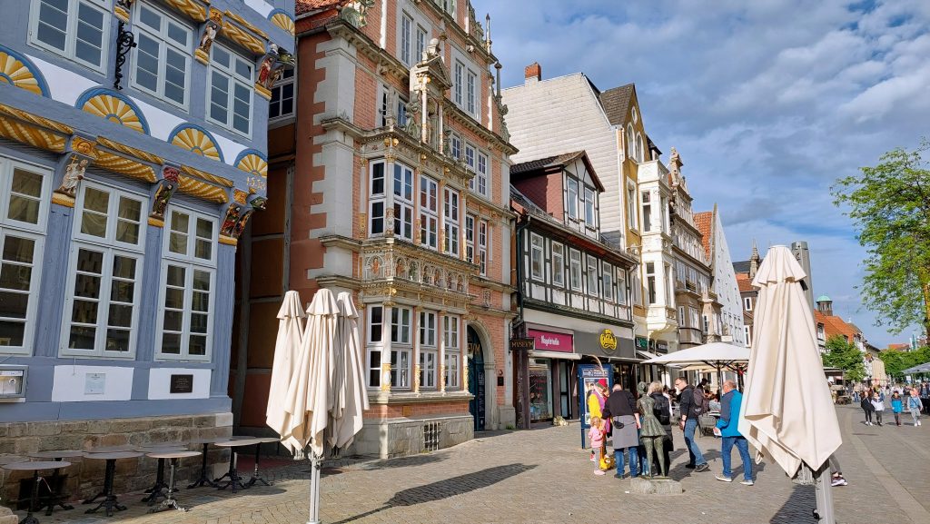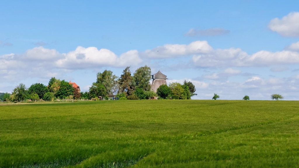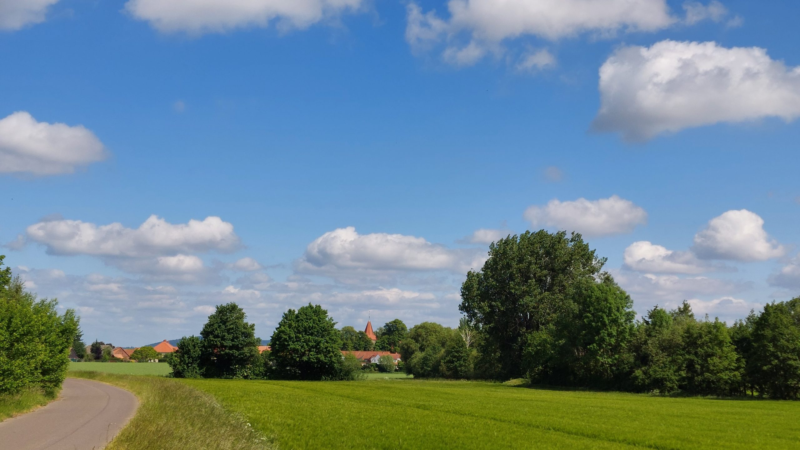 Die Sonne scheint, der Wind ist nicht mehr so stark und die Temperaturen sollen wieder auf etwa 20 Grad steigen: Dieser Tag macht Lust auf’s Radeln! Nach einer ruhigen Nacht und etwas Frühstück (das meiste lass ich mir einpacken) geht’s frisch gestärkt auf’s Bike. Die Strecke ist mit gut 90 km deutlich kürzer als gestern und größere Steigungen fehlen völlig. Viele Gründe also, um locker und gut gelaunt loszutreten, wenn da nur die Sitzbeschwerden nicht wären. Ich gebe mir Mühe, sie auszublenden und es gelingt mir erstaunlich gut. Man merkt deutlich, dass ich mittlerweile in der Norddeutschen Tiefebene angekommen bin. Berge sucht man auch am Horizont vergeblich. Die Landschaft ist aber abwechslungsreicher als ich befürchtet hatte. Hin und wieder gibt es doch kleine Hügel – Felder, Wiesen und kleine Wälder wechseln sich ab. Besonders die kleinen Örtchen mit ihren schmucken Fachwerkhäusern sind sehr schön anzuschauen.