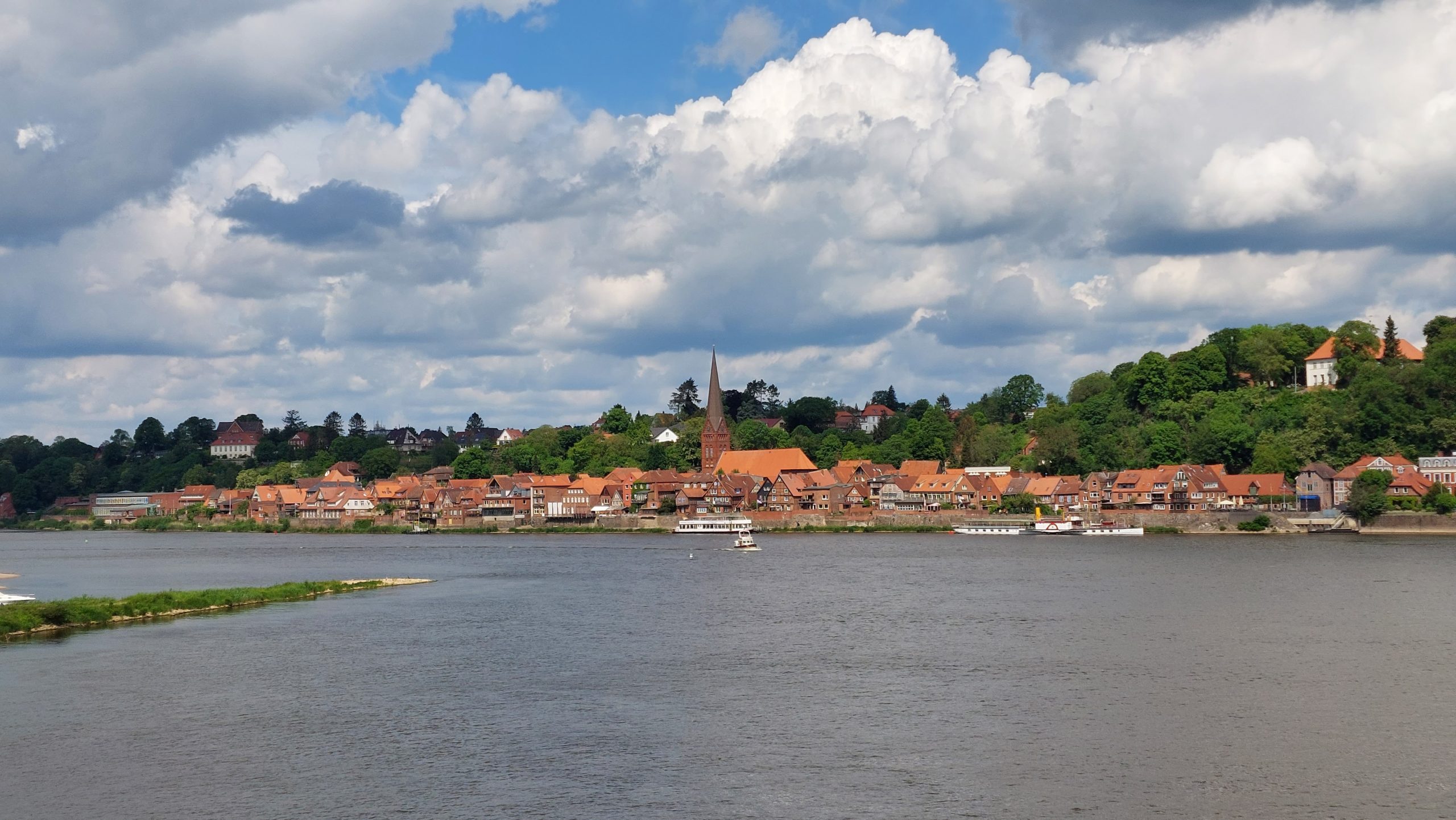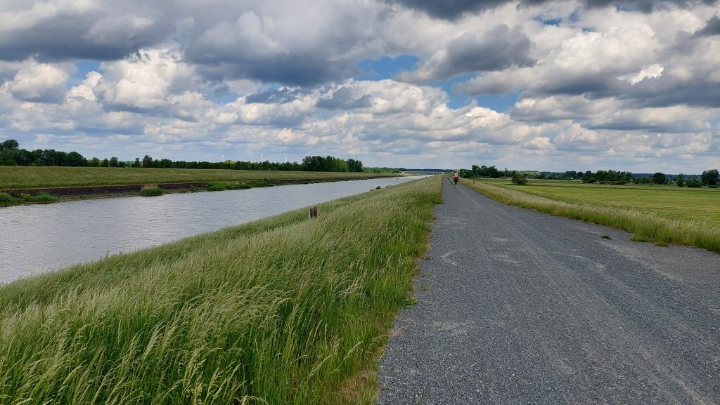 Ganz in der Nähe unseres Startpunkts liegt das Schiffshebewerk Scharnebeck, das bei seiner Errichtung in den 70ern mit einer Fallhöhe von 38m das größte der Welt war. Dort treffen wir auf den Elbe-Seiten-Kanal. Auf seinem Deich sind wir über 12km unterwegs. Der Wind schiebt uns sanft an, sodass wir schnell in einen Flow kommen. Immer schnurgerade mit Blick in die umliegenden Wiesen und Felder, bis wir bei Lauenburg an der Kanalmündung die Elbe erreichen. Über eine Brücke überqueren wir sie und haben einen fantastischen Blick auf die Altstadt.