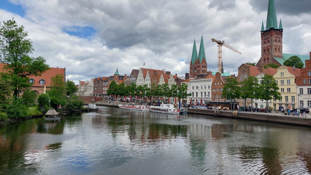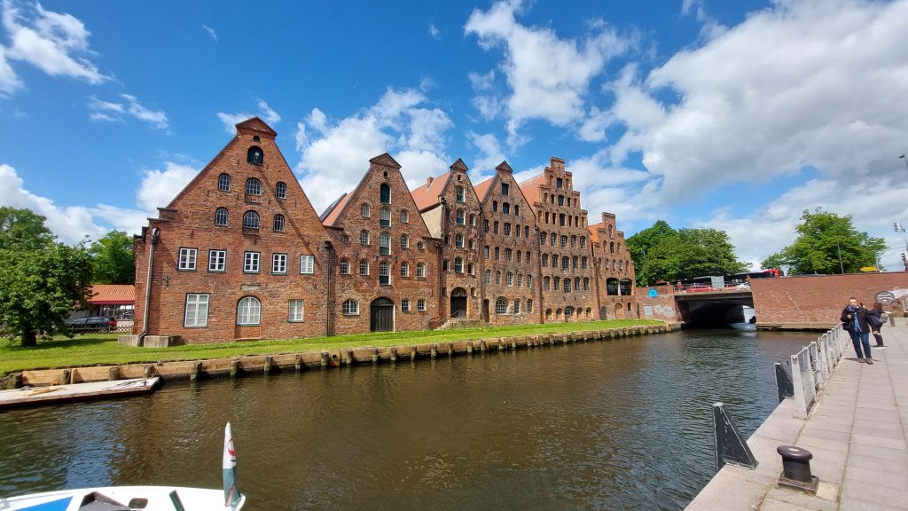 Nach 10km erreichen wir wieder „unseren“ Elbe-Lübeck-Kanal, an dem wir uns gestern schon so wohl gefühlt hatten. Den zweiten Tag sind wir jetzt auf der Alten Salzstraße zwischen Lüneburg und Lübeck unterwegs, im Altertum eine der wichtigsten Nord-Süd-Verbindung in Deutschland. In Lüneburg wurde das Salz abgebaut, das man in Lübeck für die Heringsverarbeitung brauchte. Für den Transport wurden schon im 14. Jahrhundert Kanäle angelegt und neben ihnen die Treidelpfade, auf denen die Gäule die Kähne mit Salz ziehen konnten. Aus ihnen wurden später Radwege, und einer dieser bringt uns nach 35km in die Hansestadt Lübeck.
