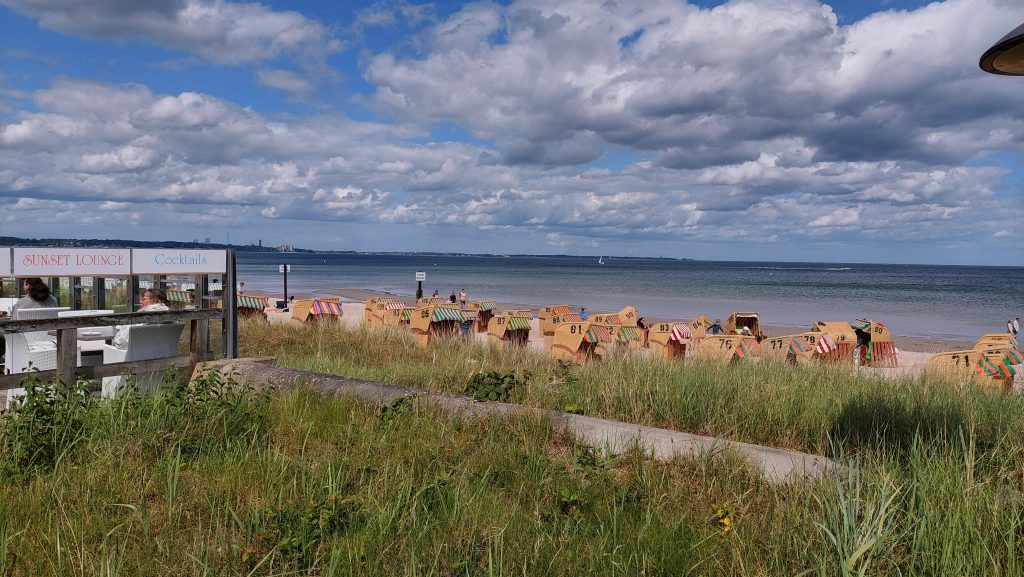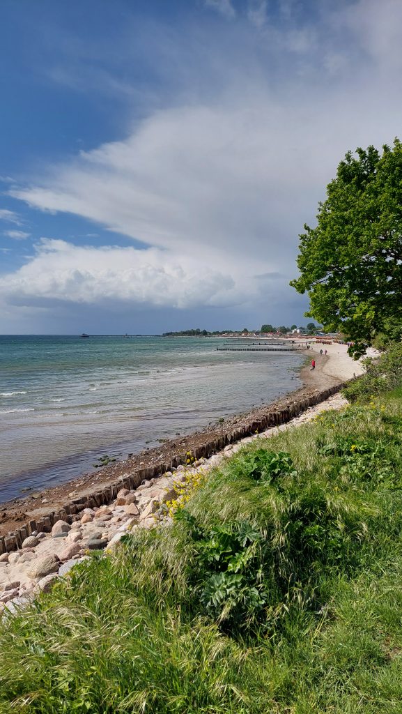 Die ersten 20km fahren wir auf und ab quer durchs Land, bis wir bei Grömitz an die Küste kommen. Den ersten großen Schauer haben wir schon abgepasst, indem wir uns rechtzeitig untergestellt haben. Ab Grömitz fahren wir auf dem Deich entlang Richtung NO, so dass der Wind sogar unterstützend wirkt. Die dunklen Wolken haben sich für den Moment verzogen und wir genießen den fantastischen Ausblick auf das Meer. Die nächsten Schauer nähern sich derweil in rasender Geschwindigkeit, es wird heftiger und es fällt uns immer schwerer, rechtzeitig Schutz zu finden.
