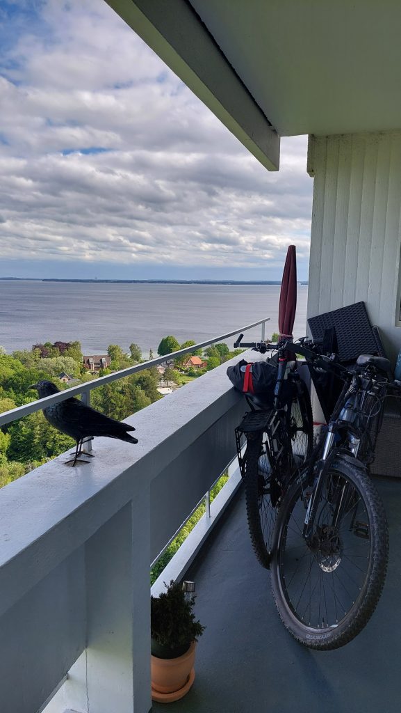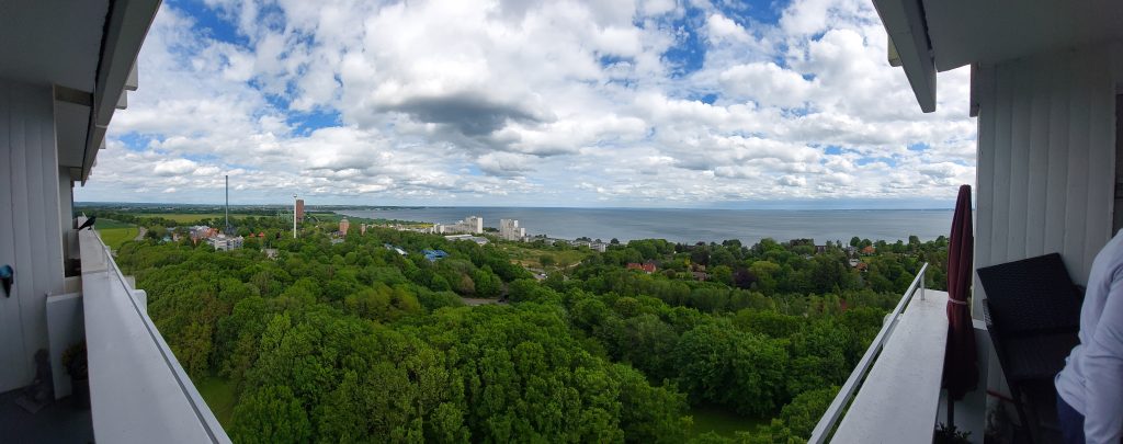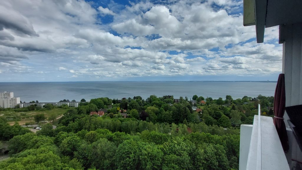 Kurz vor Ankunft in unserer Bleibe dann der nächste Schock: Ich habe für die Nacht eine Ferienwohnung gebucht, von der es keine Außenaufnahmen gab. Auf den letzten Kilometern wird deutlich, warum. Vor uns liegt ein Hügel, an dessen Spitze sich mehrere fürchterliche Hochhäuser empor recken. Mich erinnern sie von weitem an den Ben-Gurion-Ring in Bonames, ein Problemviertel, das die Frankfurter auch „Golanhöhen“ nennen. Wir erreichen die Häuser und treffen uns dort mit der Verwalterin, einer sehr netten Frau. Mit gemischten Gefühlen steigen wir in den Aufzug und fahren in den 17. (!) Stock, die Räder nehmen wir sicherheitshalber mit. Wir betreten die Fewo und …Wow!!! Die Wohnung ist total schnuckelig eingerichtet und hinter den großen Glasfenstern und dem Balkon liegt uns gefühlt die halbe Ostsee zu Füßen.