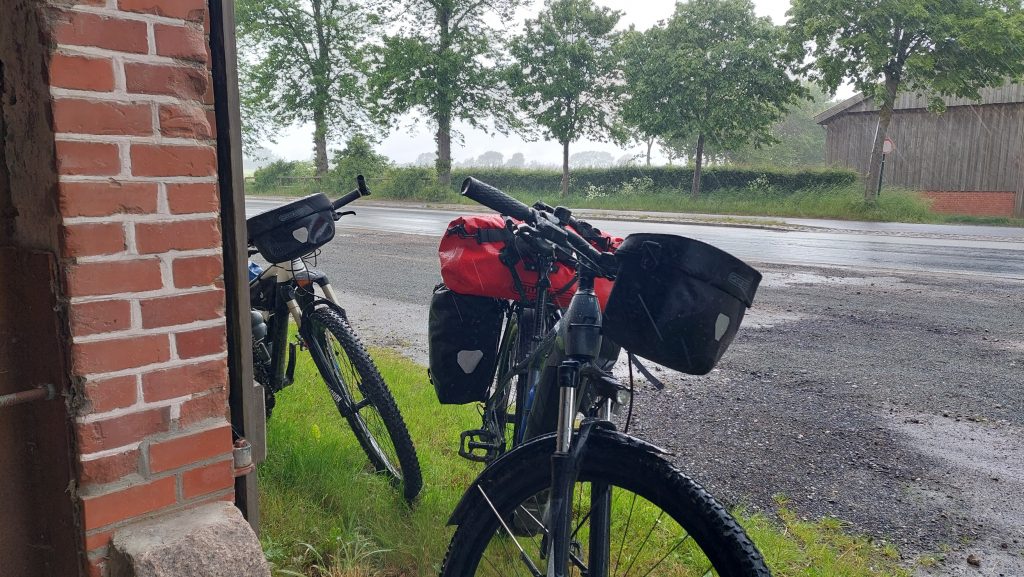 Ich bin schon etwas genervt, als wir uns in der Nähe von Süssau gerade noch in ein Buswartehäuschen retten, bevor ein richtiges Unwetter auf uns hernieder geht. In dem Unterstand hat sich bereits ein Leidensgenosse in Sicherheit gebracht und wir kommen natürlich sofort ins Gespräch. Er ist eine echte Frohnatur und versprüht so gute Laune, dass man in dem Moment sogar dem Unwetter noch etwas Positives abgewinnen kann. Er ist in Dänemark gestartet und will über Lübeck an der Ostseeküste noch weiter bis Polen. Obwohl auch schon in meinem Alter, ist er mit Zelt unterwegs und hat wirklich alles auf dem Rad dabei, einschließlich Dosenravioli und einem Sixpack Bier. In der kurzen Zeit unseres Treffens haben wir viel Spaß zusammen. Wieder einmal zeigt sich, wie leicht man beim Radeln mit anderen Menschen in Kontakt kommt und welche Verbundenheit gerade mit “Leidensgenossen” in solch einer Situation schnell entsteht.