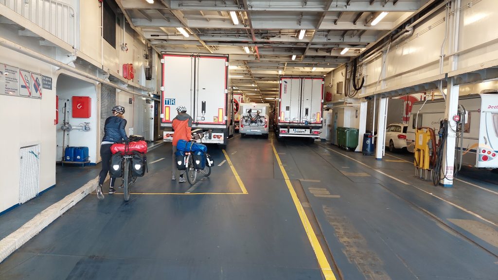 Los geht es Richtung Norden und oft genug haben wir Schwierigkeiten, die Spur zu halten, denn der Sturm aus West setzt uns ordentlich zu. Das Fluchen habe ich mir aber mittlerweile abgewöhnt und versuche diese Art von Widrigkeiten als norddeutsches Goodie anzusehen, in dessen Genuss nicht jeder kommt. Nach nicht einmal einer Stunde haben wir unser vorläufiges Ziel erreicht. Wir stehen am Fehmarnbelt, genauer gesagt am Hafen von Puttgarden, von wo aus uns die Fähre in 45 Minuten nach Rødby in Dänemark bringen soll. Ich denke daran, dass wir erst vor einem dreiviertel Jahr von Eschborn nach Venedig geradelt sind und ich jetzt – beide Touren zusammengenommen – einmal Deutschland in Nord-Süd-Richtung (und noch mehr) durchquert habe.